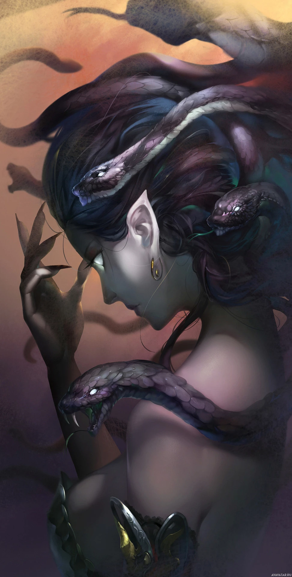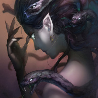 pointy ears, and her body is partially covered with snake-like creatures that appear to be an extension or part of her form. The style of the artwork suggests it could be from