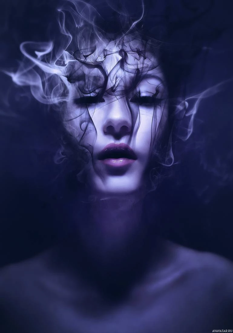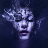 dark hair and is wearing what seems like a dark outfit with purple tones. The smoke is swirling around her head, contributing to