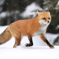 The image shows a red fox walking across a snowy landscape with trees. It appears to be during winter, as evidenced by the snow covering the ground and the presence of fallen snowflakes in the air.