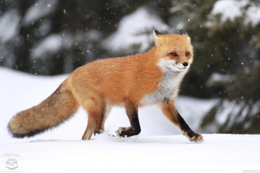 На картинке изображена рыжая лиса, идущая по заснеженному ландшафту с деревьями. Судя по всему, это происходит зимой, о чем свидетельствует снег, покрывающий землю, и присутствие упавших снежинок в воздухе.