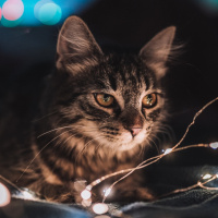 The image shows a cat looking intently at something. It appears to be indoors with some string lights illuminating the scene, creating a cozy atmosphere. There are no people or other animals visible in this particular frame of the picture.