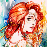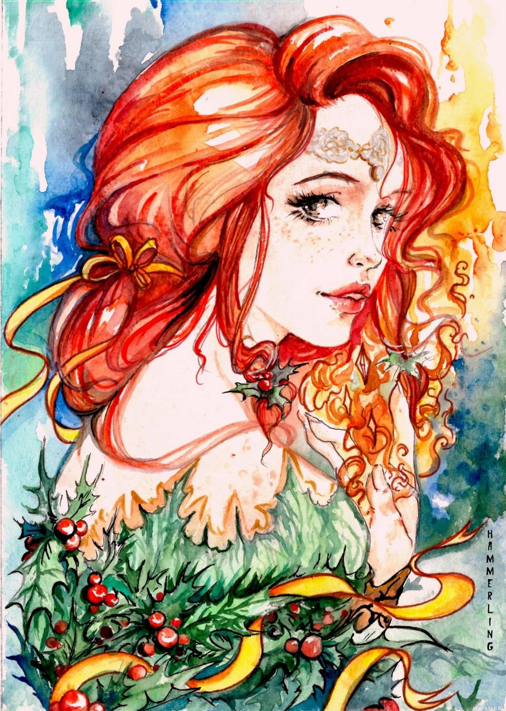 red hair and striking green eyes, wearing what seems to be an elven-inspired costume adorned with berries, leaves, and flowers, which are typical elements found in the lore of this fantasy universe. The art style leans towards realism with