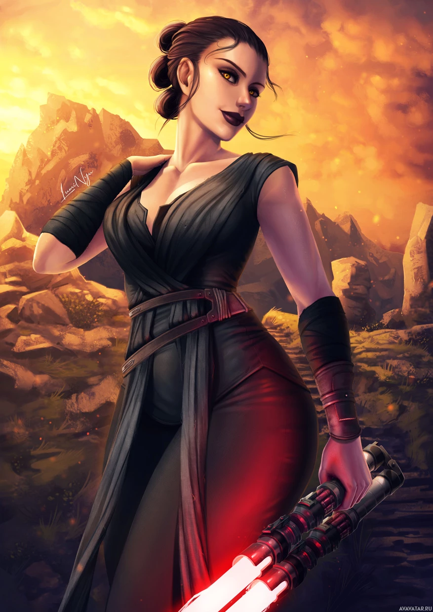 the Star Wars franchise. She is wearing her signature black and red outfit, with a lightsaber in hand, and she has