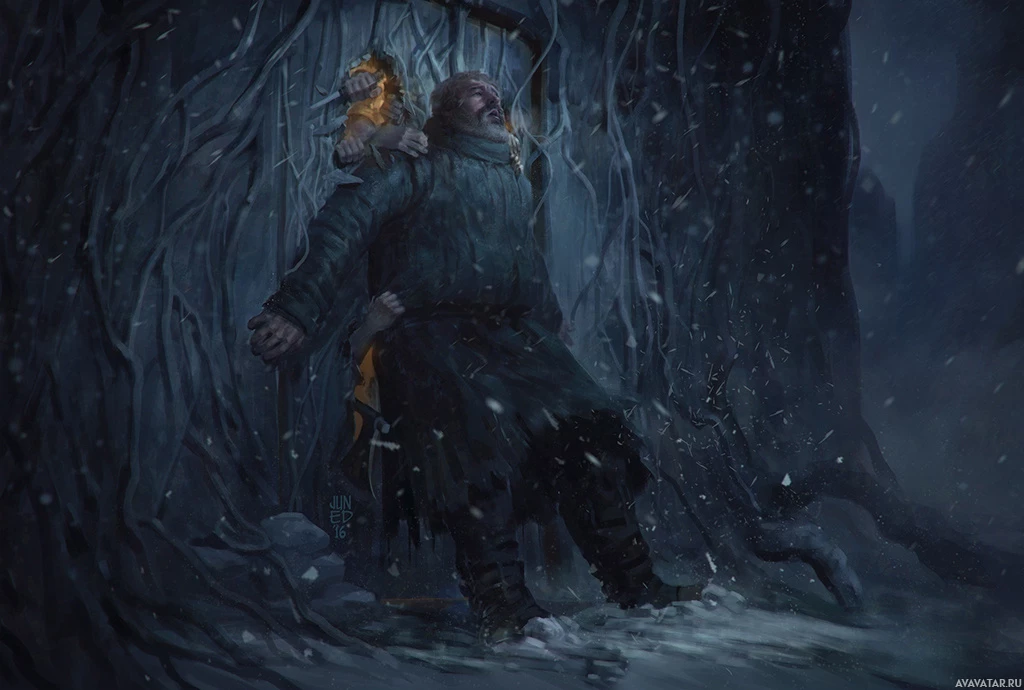 a snowy forest or cave setting, and ahead of them, there seems to be a figure in a bright red robe or cloak that could indicate a character from the series known for wearing such attire. The image captures a sense of mystery and intrigue typical of the "Game of Thrones" narrative.