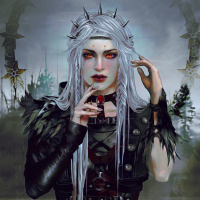 The image depicts a character with long white hair, dressed in dark armor or clothing that suggests