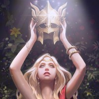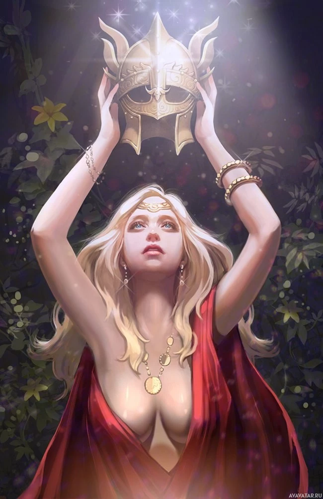 blonde hair, wearing a red dress with gold embellishments. She is holding what appears to be