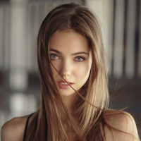 На картинке изображена молодая женщина с длинными волосами. У нее нейтральное выражение лица, она смотрит прямо в камеру. У нее голубые глаза и светлая кожа. На женщине надето что-то похожее на черный топ или платье без рукавов, открывающее часть плеча. Размытый фон наводит на мысль о помещении с некоторыми архитектурными элементами.