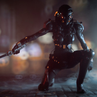 an urban environment with a neon-lit, dilapidated aesthetic, which could suggest that the scene takes place in a dystopian future. The character's pose and attire give it a formidable and intimidating appearance, which is consistent with typical depictions of soldiers or warriors from