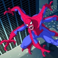 The image shows an animated depiction of Spider-Man, a fictional superhero character from Marvel Comics. He is shown in his iconic red and blue costume with the spider emblem on his chest, and he appears to be in motion, likely swinging or leaping.