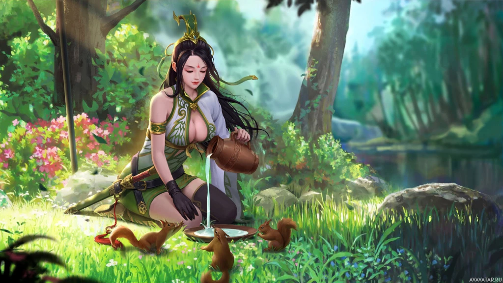dark hair and is dressed in what could be interpreted as fantasy or adventure attire, suggesting she may have a role related to the outdoors or wildlife. The background features trees and suggests a peaceful