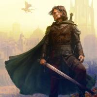 На картинке изображен человек в исторической или фантастической одежде, в том числе в плаще, с мечом в руках. Он стоит на выступе скалы или холма, на фоне городского пейзажа, который наводит на мысль о средневековой или фантастической обстановке. Человек смотрит куда-то вдаль, создавая впечатление созерцания или наблюдения.
