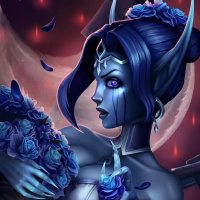 blue skin and pointed ears, suggesting an elven or drow influence. She has striking