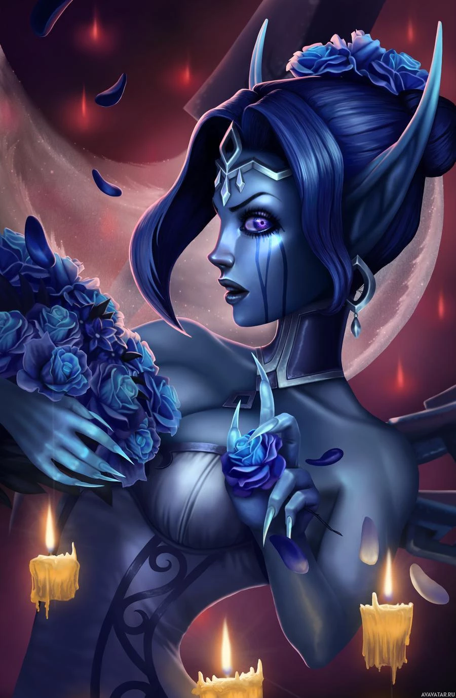 blue roses. The background is dark and moody, enhancing the mystical or magical atmosphere around her.