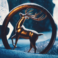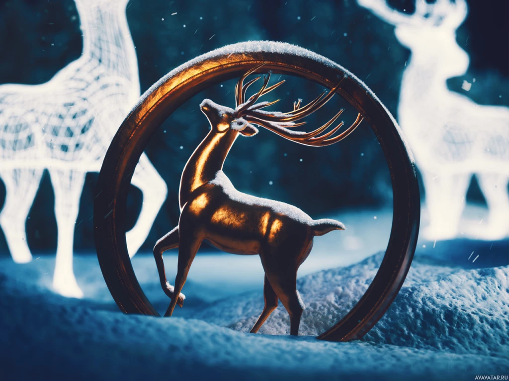 a golden color, prominently displayed in front of the deer. The overall setting suggests a winter holiday theme.