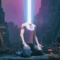 The image depicts a person kneeling down with their arms outstretched in front of them, creating an illusion that there is a bright, glowing light emanating from the hands. The surroundings appear to be