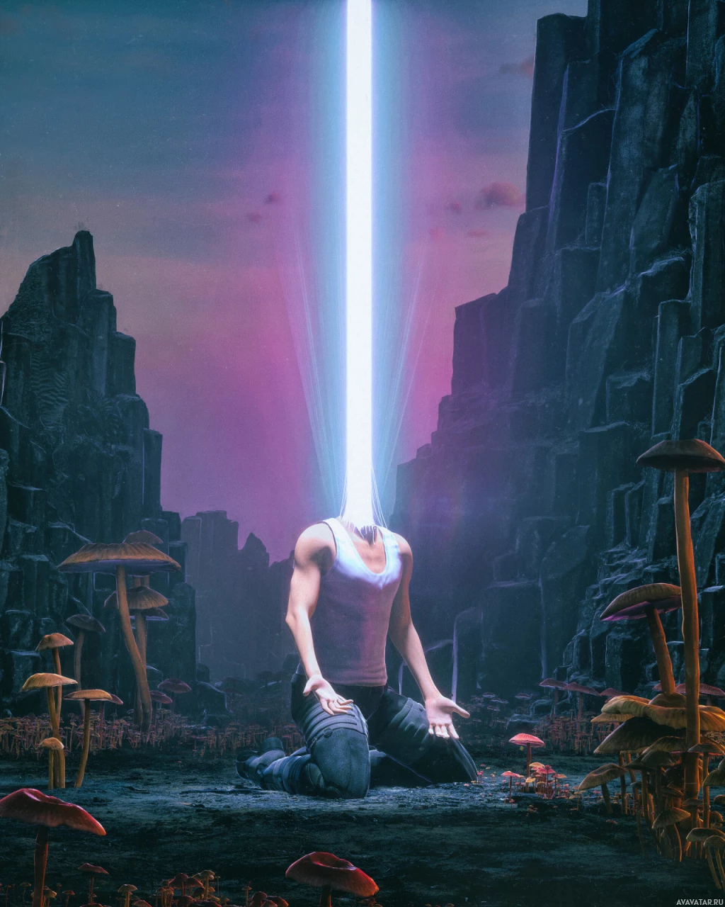 a rocky landscape with moss and small plants on the ground. The overall atmosphere of the image is surreal and ethereal, possibly suggesting a moment of intense concentration or