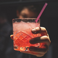 a mixed drink. The drink appears to be a gin-based cocktail, possibly a martini or a similar type of drink with a splash of soda and
