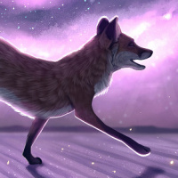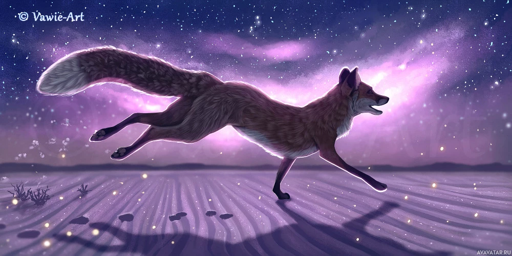 a night sky with stars, creating a sense of movement and freedom. The fox is depicted with