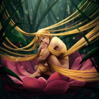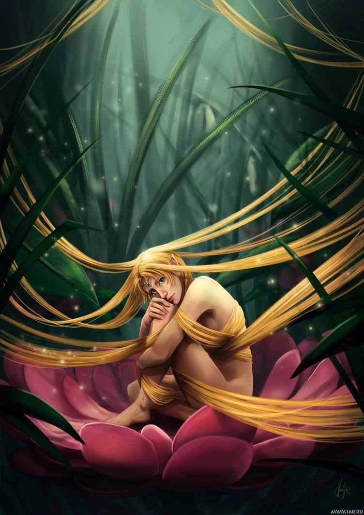 long hair and large wings. The character is sitting on a pink lotus flower in a forest setting filled with tall grasses and