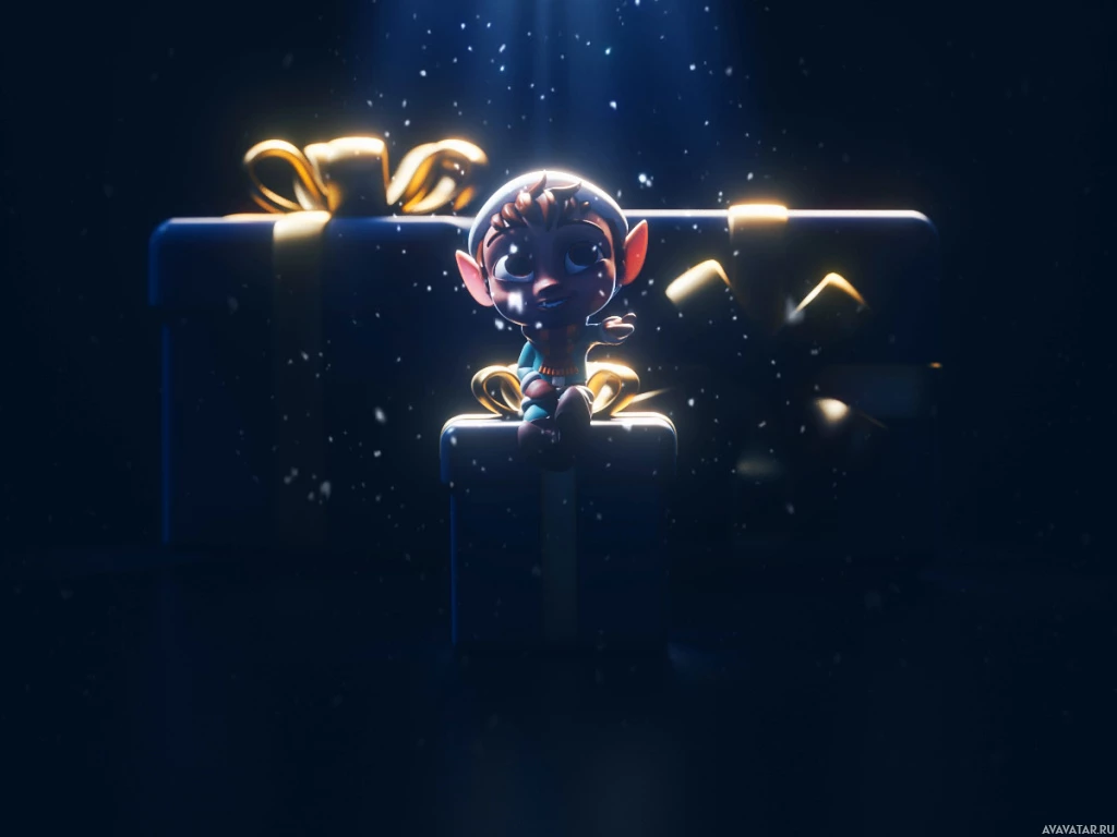 an animated character sitting on top of what appears to be a gift, likely indicating that the character is receiving a present. The background has