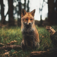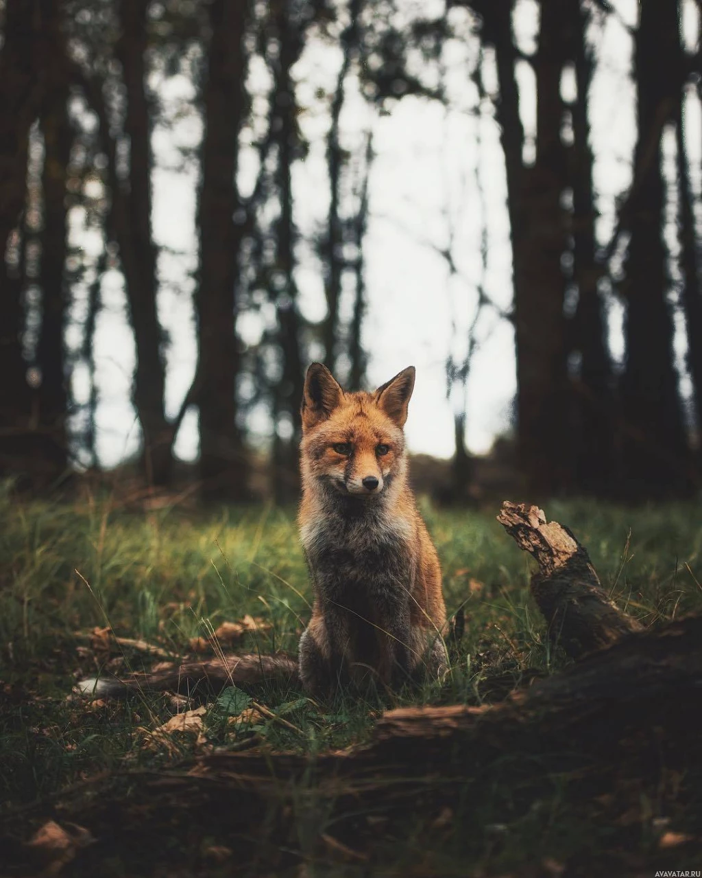 На картинке изображена рыжая лиса, сидящая на земле в окружении деревьев и листвы. Кажется, что она находится в лесном массиве, а солнечный свет проникает сквозь кроны деревьев над ней.