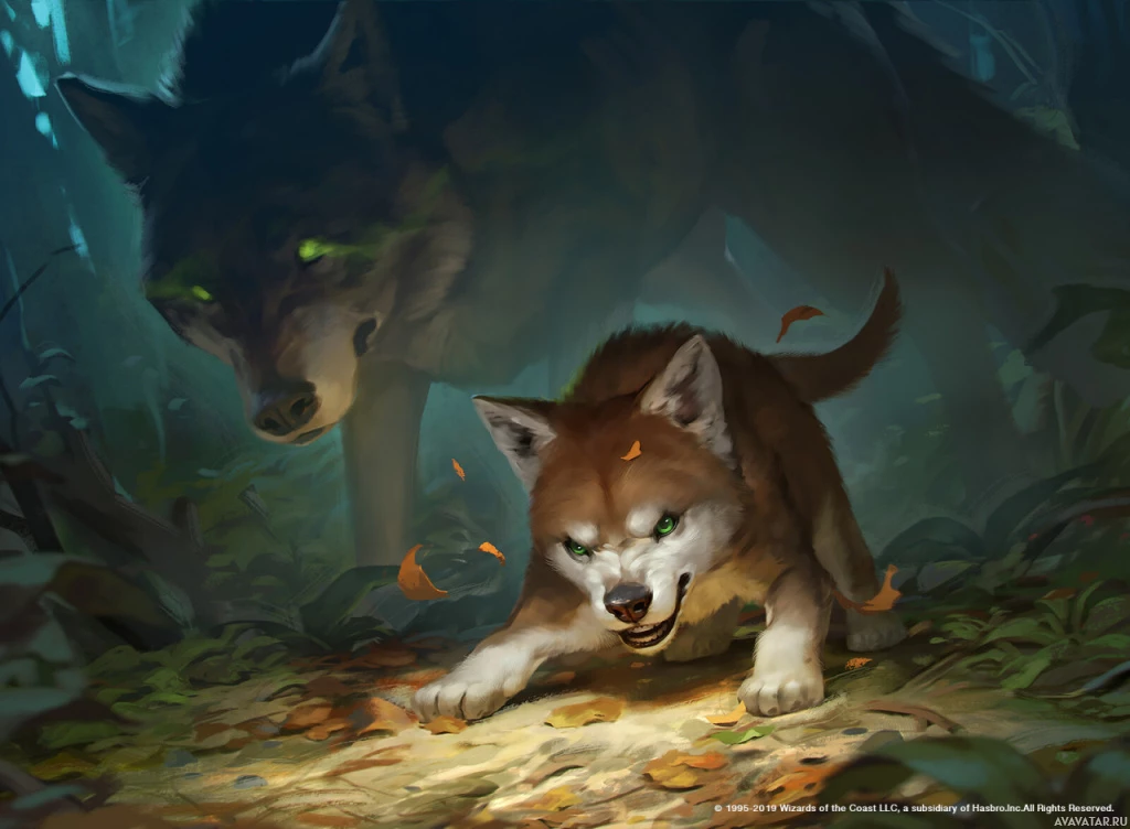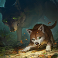 an adult wolf with glowing eyes, possibly representing the mother. On the right, there is a younger