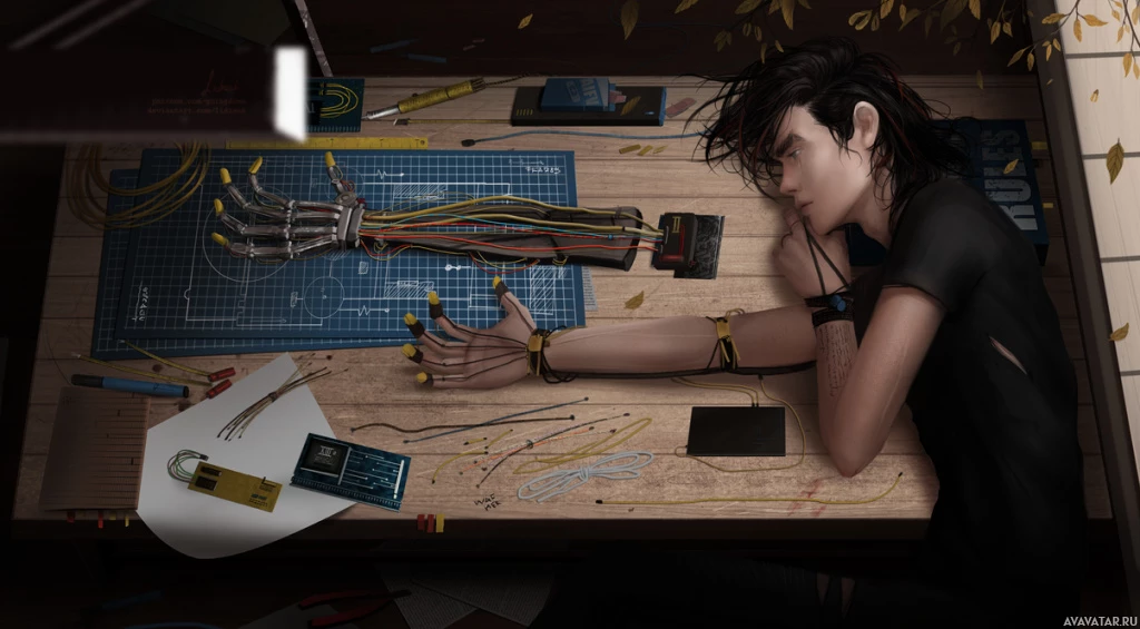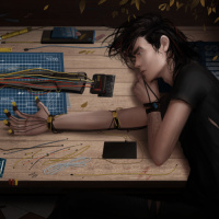 electronic components and tools spread out around them. There are wires, circuits, a soldering iron, and what appears to be a breadboard or circuit board on the table. The setting suggests that the person is working on an electronics project, possibly involving robotics or