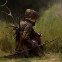 a hooded cloak, suggesting they might be a wanderer, hermit, or someone from a bygone era. The figure is holding a staff and has
