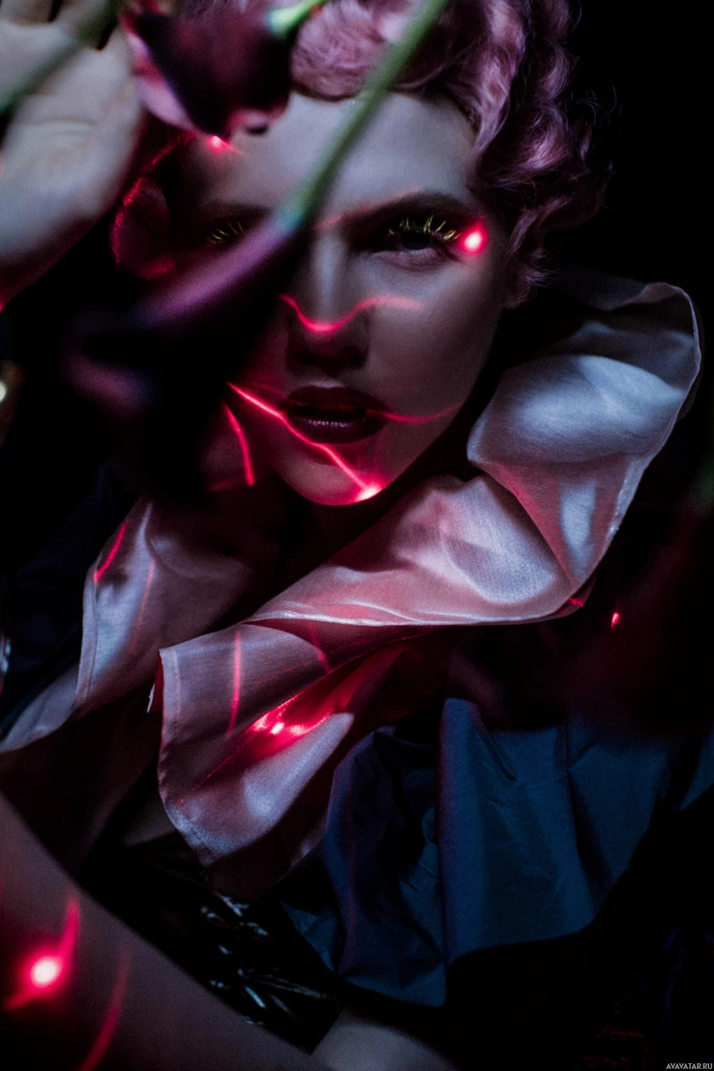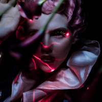 floral accessory near their face, adding to the overall theme of the image. The background is blurred and indistinct, focusing the viewer's attention on the central figure.