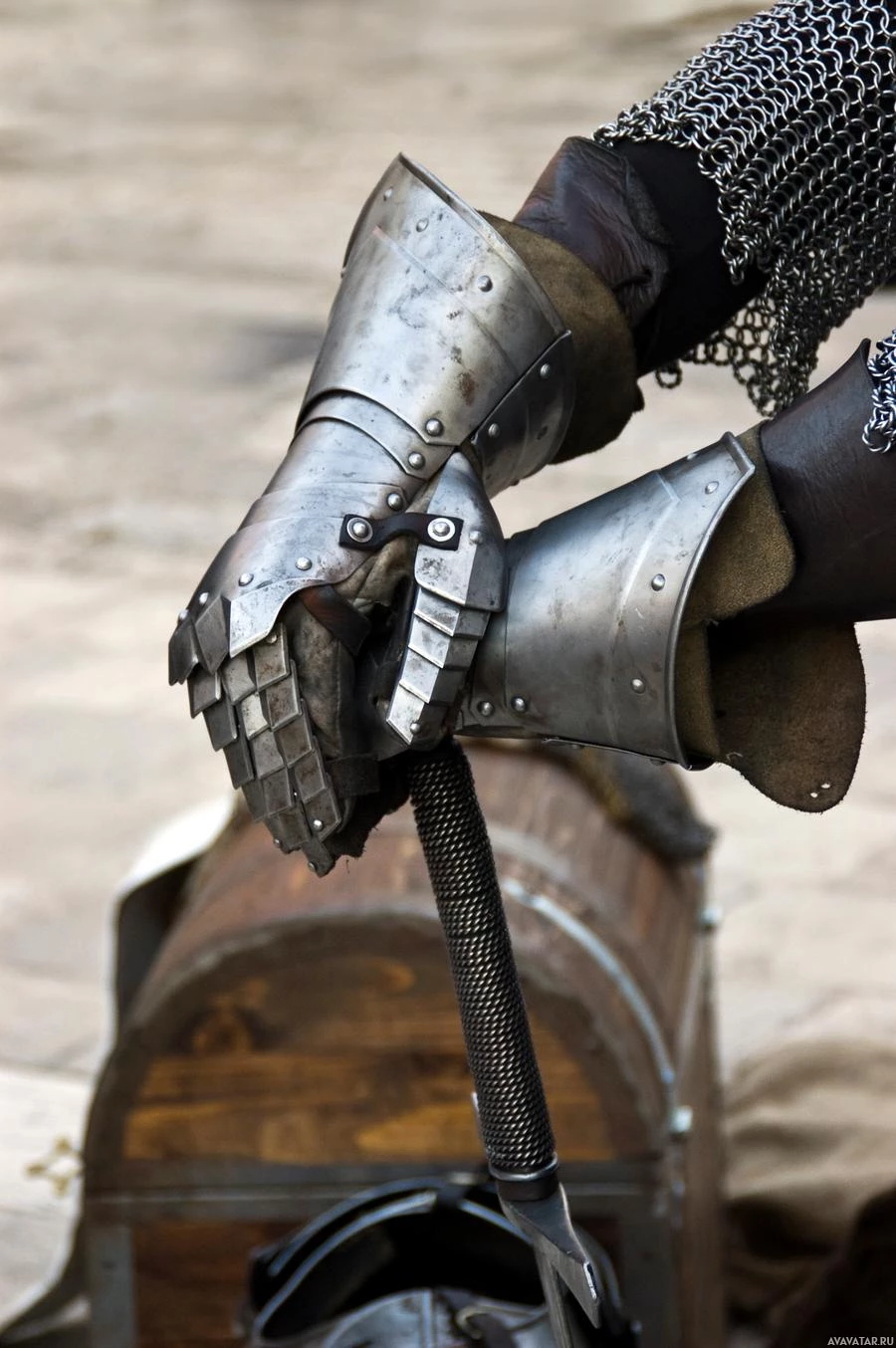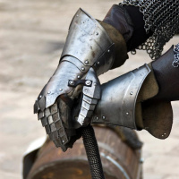 medieval armor, specifically chain mail with metal plates on the arms and legs. They appear to be holding a hammer in one hand while working on what looks like