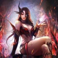 a confident pose and is holding what appears to be a magical artifact or spell component in her hand. The background features lava and