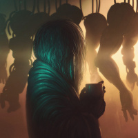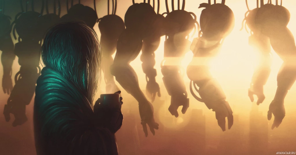 focused gaze on the robots. There is also a cup visible near the person, suggesting they might be having a drink while looking at the display. The setting has a science fiction feel due to the presence of these advanced robotic figures, which are not commonly seen in