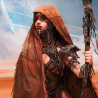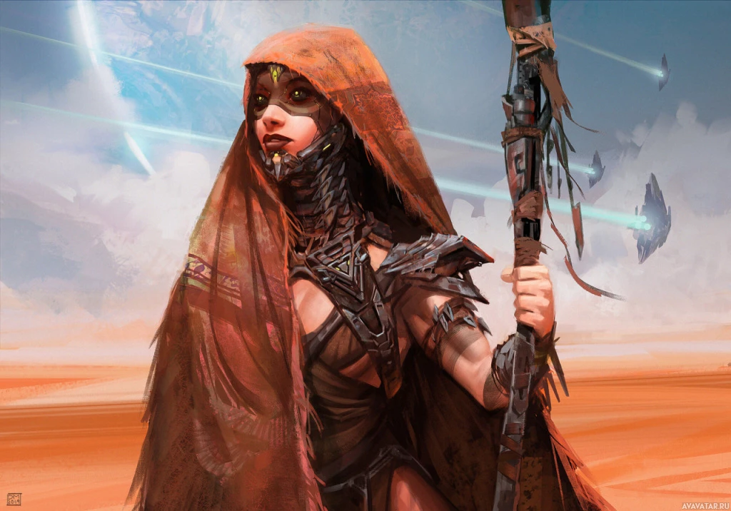 an unusual design, possibly resembling a hood, and she has some sort of headgear or mask obscuring her face. In one hand, she holds what appears to be a staff with