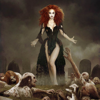 red hair, dressed in a dark outfit that suggests a gothic or horror theme. She is standing confidently amidst