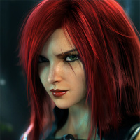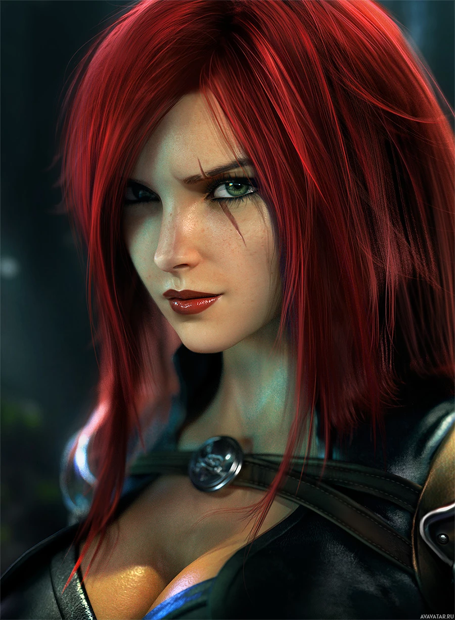 red hair, styled in what appears to be a wavy or curly fashion. She has a stern expression on her face and is wearing an outfit that could suggest a fantasy or sci-fi setting, possibly related to