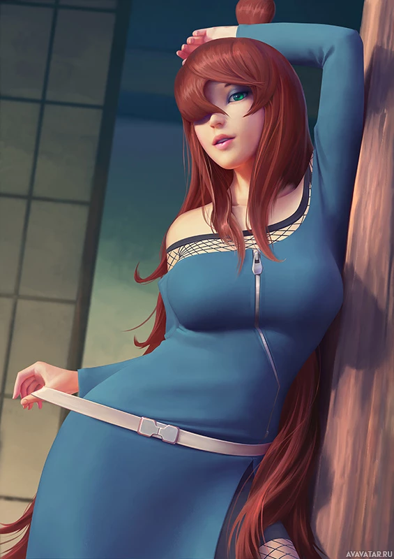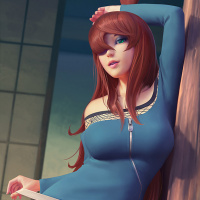 female character with red hair, wearing a blue top. She is leaning against a wall or a post with one hand on her hip and the other on her head, seemingly in a contemplative or relaxed pose. Her expression appears to be neutral with a hint of curiosity or thoughtfulness. The art style suggests it could be from