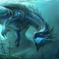 a fantastical scene with a large dragon-like creature in the water. It appears to be underwater, as suggested by the bubbles rising around its neck and head. In the background, there are elements that resemble wrecked ships or debris scattered on