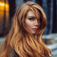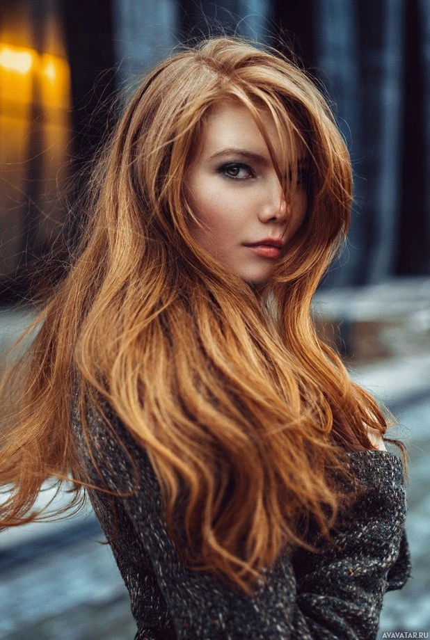 a young woman with long red hair. She is looking directly at the camera, and her expression appears to be neutral with a hint of confidence or seriousness. The lighting on her face suggests that it might be evening, possibly due to the quality of the lighting or