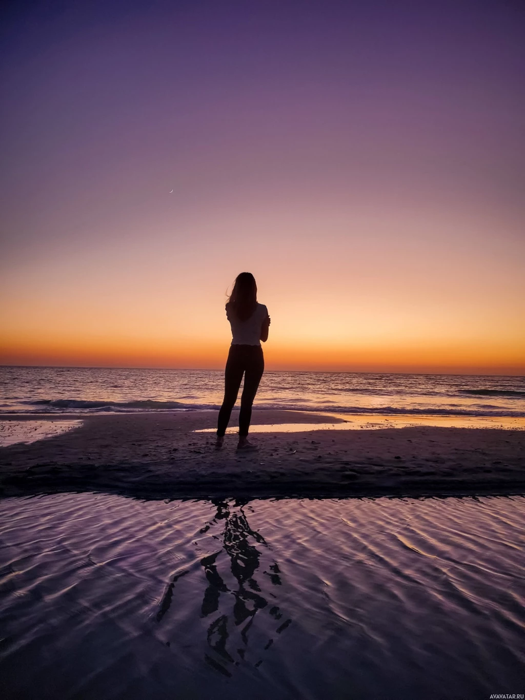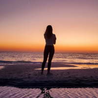 the beach at sunset. The individual appears to be looking out towards the sea, and there is a beautiful reflection of