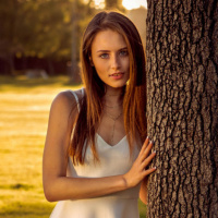 white top and her arms are crossed as she leans against a tree trunk. The setting appears to be a park or outdoor area during late afternoon, given