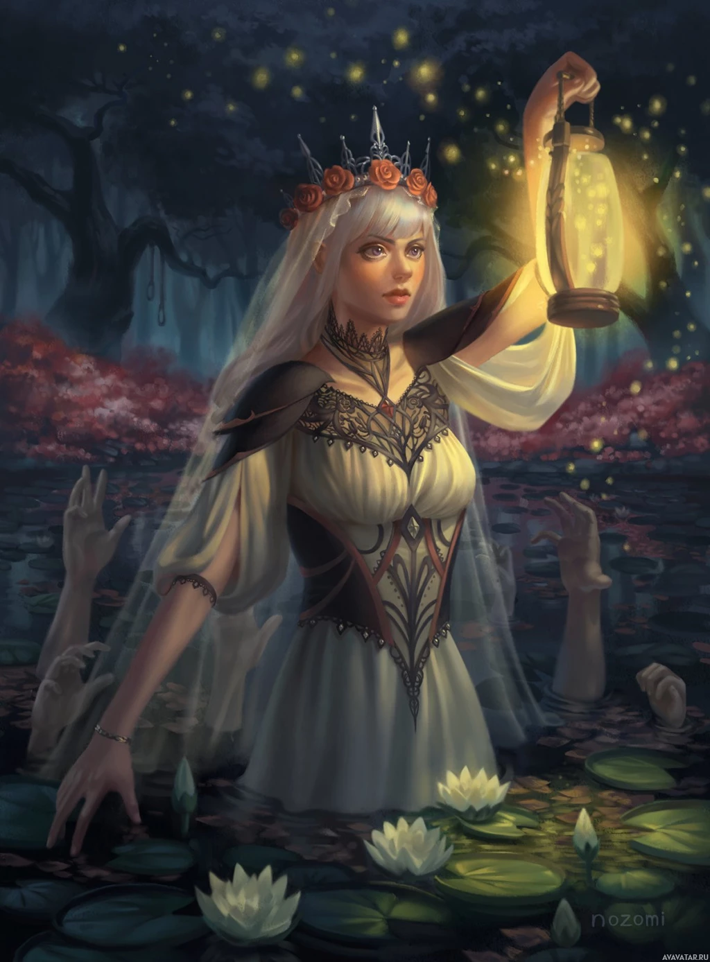 an illuminated lantern, which casts light onto her face and surroundings. In the background, there appears to be a swamp or marshland, as indicated by the presence of