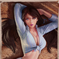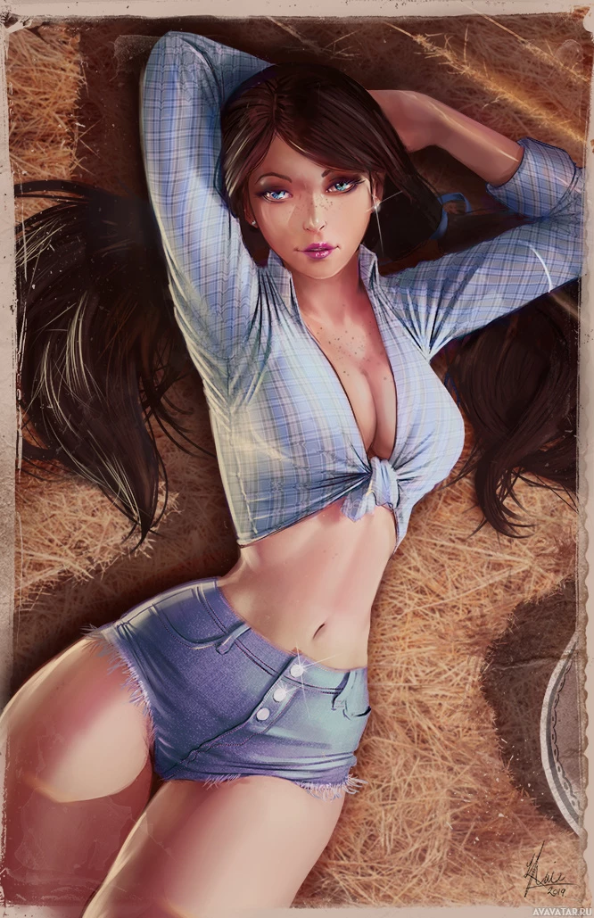 denim shorts and a button-up shirt that appears to be unbuttoned at the top. The character is laying on her stomach on what looks like hay, suggesting a relaxed and casual setting. Her pose gives off a sense of comfort and ease, perhaps indicative of a warm or summer season.