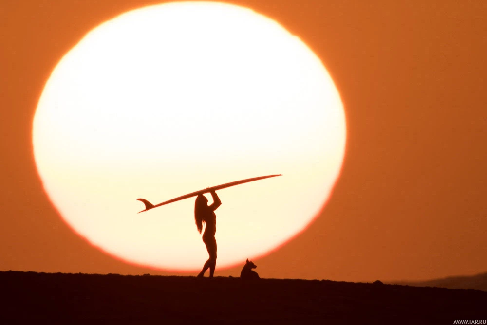 На картинке изображен силуэт человека на пляже, держащего доску для серфинга и обращенного лицом к заходящему солнцу. Эта сцена, вероятно, связана с занятием серфингом или подготовкой к серфингу. Силуэт человека на фоне ярко-оранжевого неба создает контраст, который наводит на мысль о рассвете или сумерках.