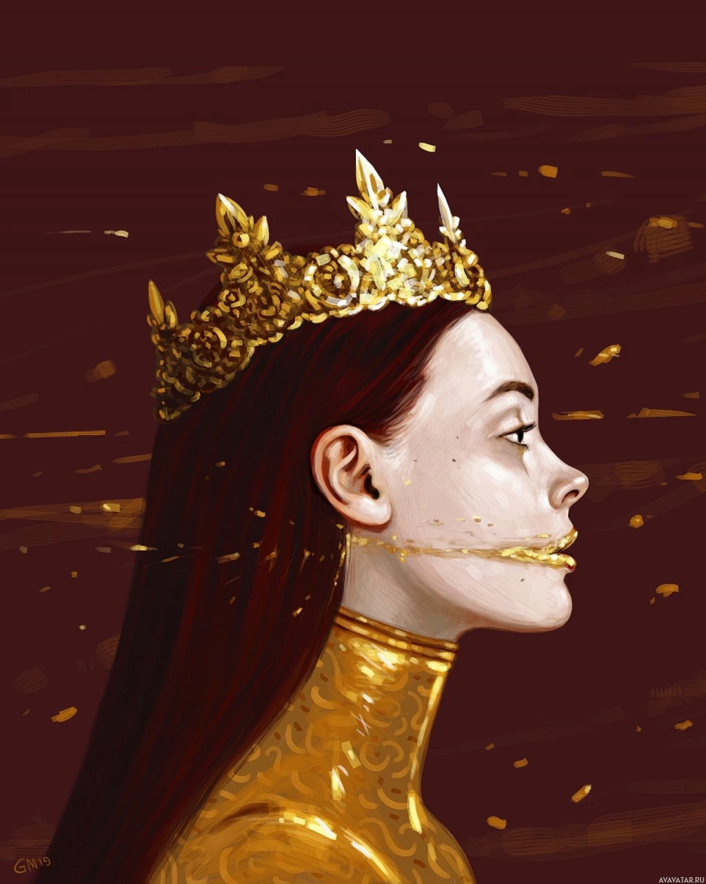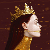 gold accents or armor, which could suggest a royal or noble status. The color palette is quite warm with