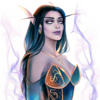 blue hair, dark skin, and is wearing a dress with ornate designs, suggesting she could be part of a fictional universe or a character from a role-playing game (RPG). There's also a glowing, magical-