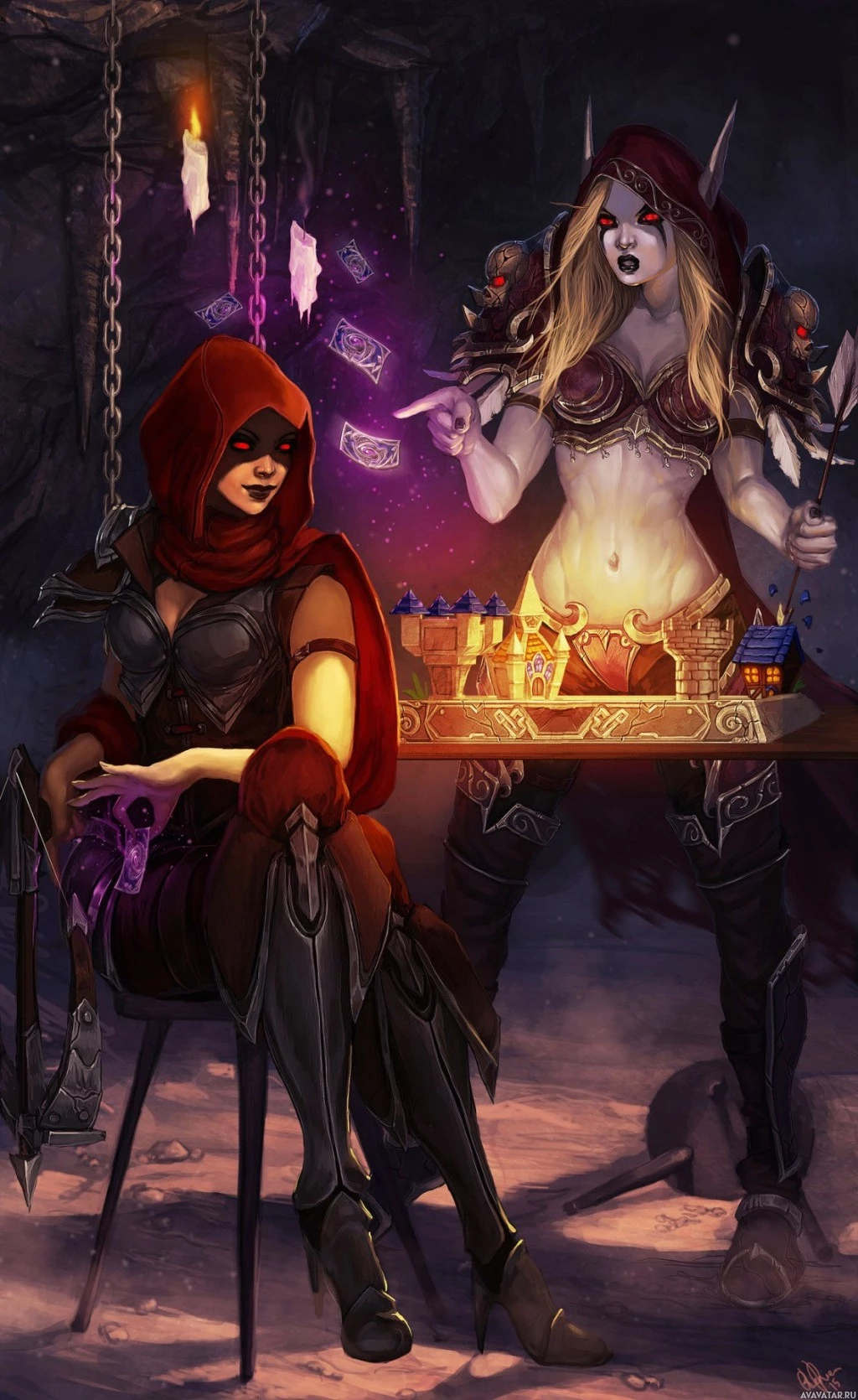 an underground setting, possibly a dungeon or a cavern. Both characters are engaging with each other, possibly in the middle of a game or a magical duel.
