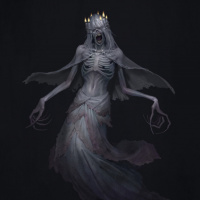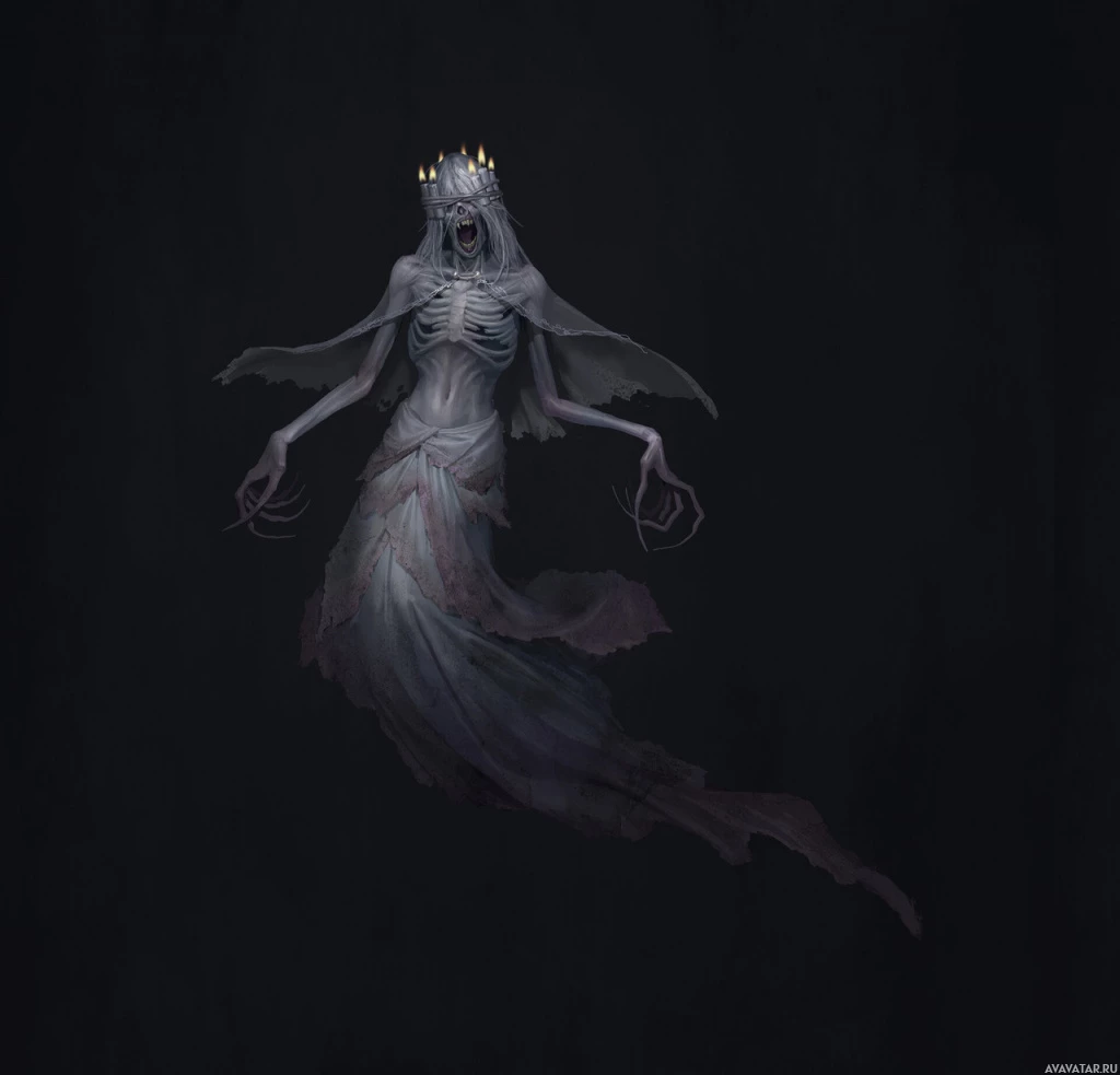 tail of a fish. The creature's skin is pale and its facial features are distorted or obscured, suggesting a ghostly or horror theme. Its hair and eyebrows seem to be floating above its head, adding to its otherworldly appearance. The creature appears to be floating against
