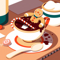 a whimsical feel, with the gingerbread man giving an amusing impression of having been caught up in the moment and accidentally tipping over the cup onto himself. Additionally, there are various other sweets around the cup, such as candy canes, which adds to