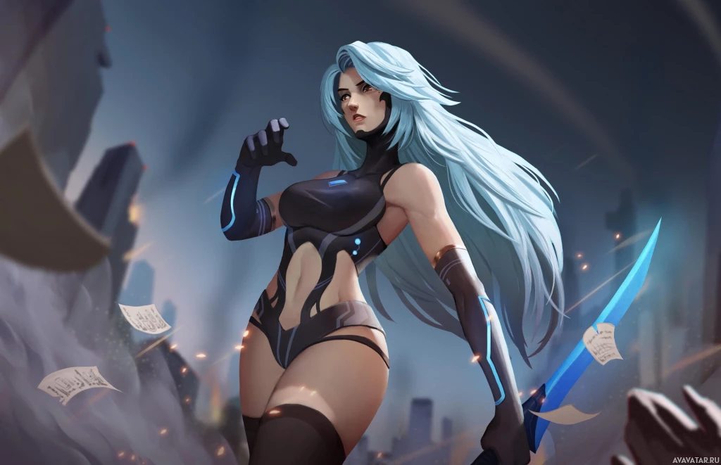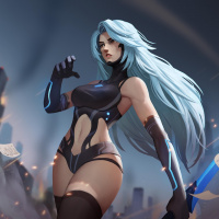 a female character with blue hair, dressed in an armored outfit. She has a confident pose and is holding a blue sword, suggesting she may be from a game or