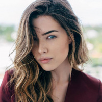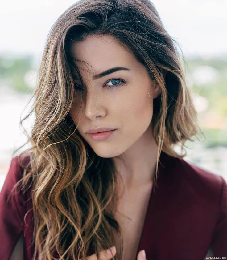 wavy hair and is wearing makeup that highlights her eyes and lips. Her gaze is directed to the side with